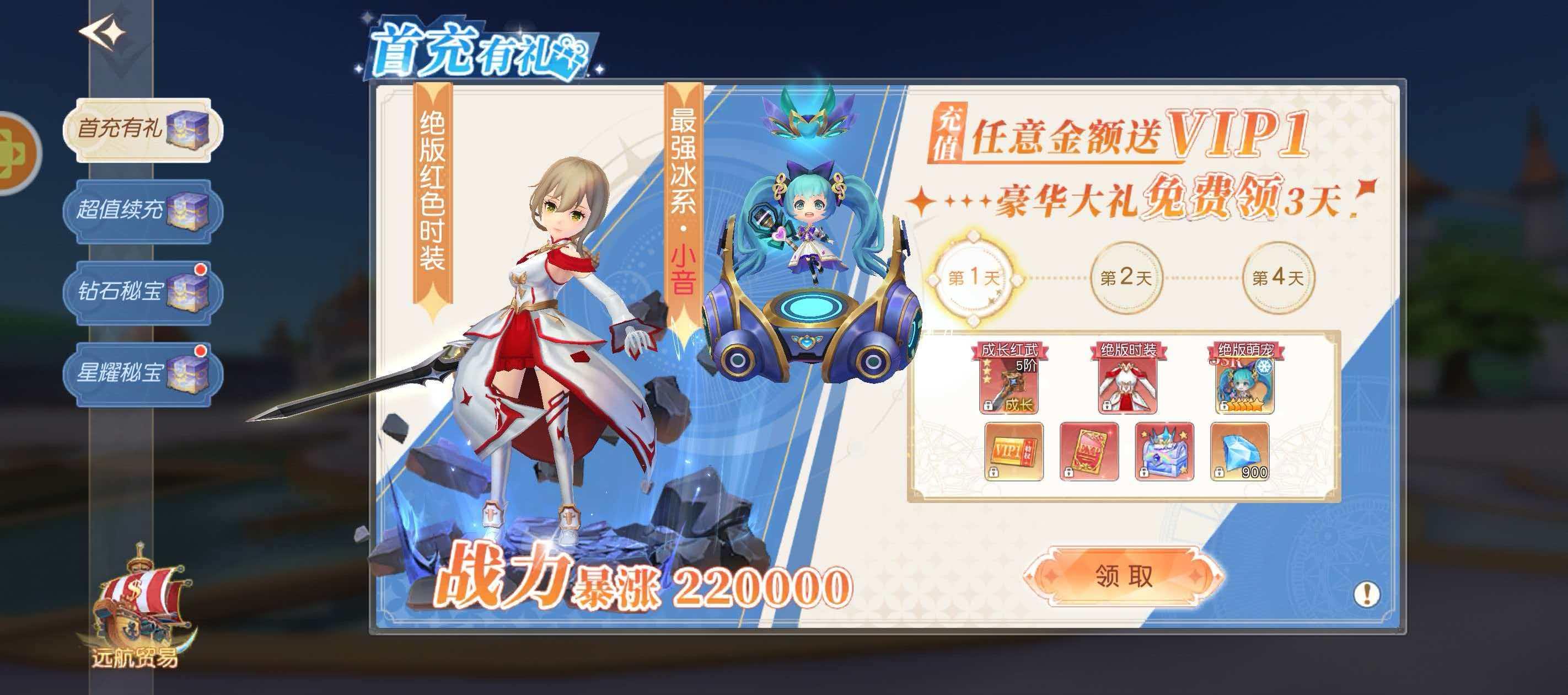 首充是一个福利力度非常高的活动,在首充界面中,玩家只要充值任意的金额就会赠送vip1的特权,还有着能够免费领取3天的豪华大礼包呢,第一天就能够领取到成长型红武和绝版时装萌宠哦。