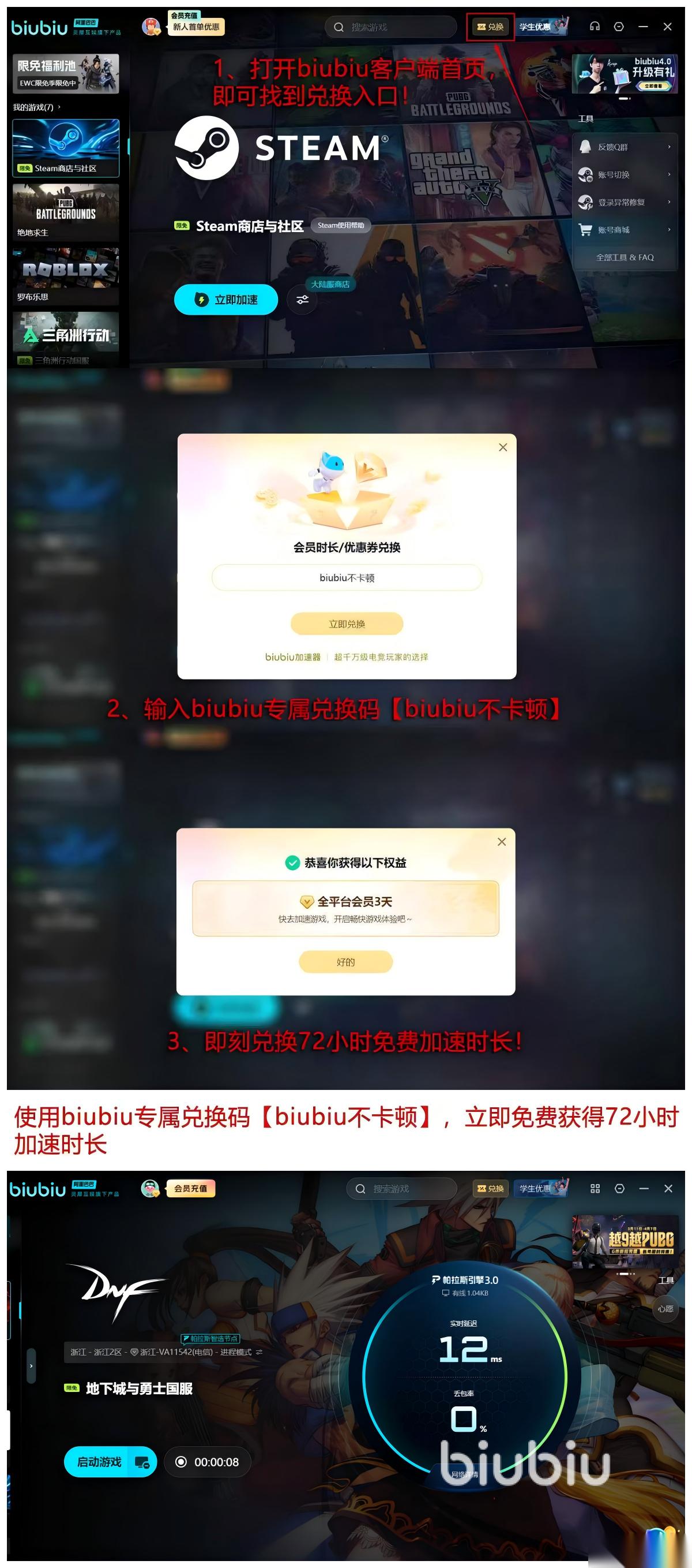 官方还赠送各位【biubiu不卡顿】这个口令,按照下面的方法输入就能获取72小时的时间,作为新玩家获取的24小时也能正常叠加,大家总计能够获得96小时的加速时间,对于还没体验过的,或者是正在犹豫是否值得购买会员的各位,是一次绝佳的体验福利。