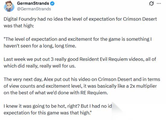 Digital Foundry表示,团队完全没料到《红色沙漠》的玩家期待值会达到“如此惊人的高度”,这种热度是他们“长久以来都未曾见过的”。作为对比,该机构上周发布了多条《生化危机9:安魂曲》的优质视频,每条播放表现均十分出色。然而,随后发布的《红色沙漠》相关视频,播放量与讨论热度几乎是《生化9》最佳单条视频的两倍。