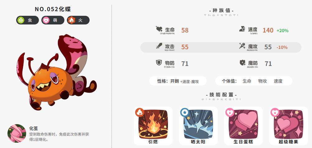 技能配置:化茧(受到致命伤害时,免疫此次伤害并获得1层萌化)、引燃、晒太阳、生日蛋糕、超级糖果