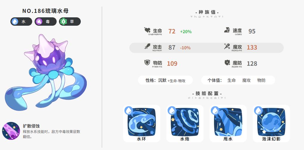 种族值:生命72(+20%)、速度95、攻击87(-10%)、魔攻133、物防109、魔防128