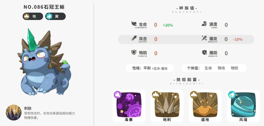 种族值:生命(+20%)、速度、攻击、魔攻0(-10%)、物防、魔防(具体数值图像缺失)