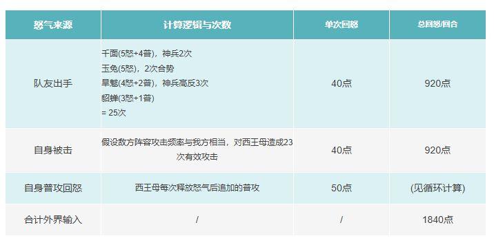 保守实战取值:在游戏回合时间与动画限制下,西王母每回合可完成1/3的循环,即15次“怒气+普攻”循环。我们取15次循环作为计算基准。