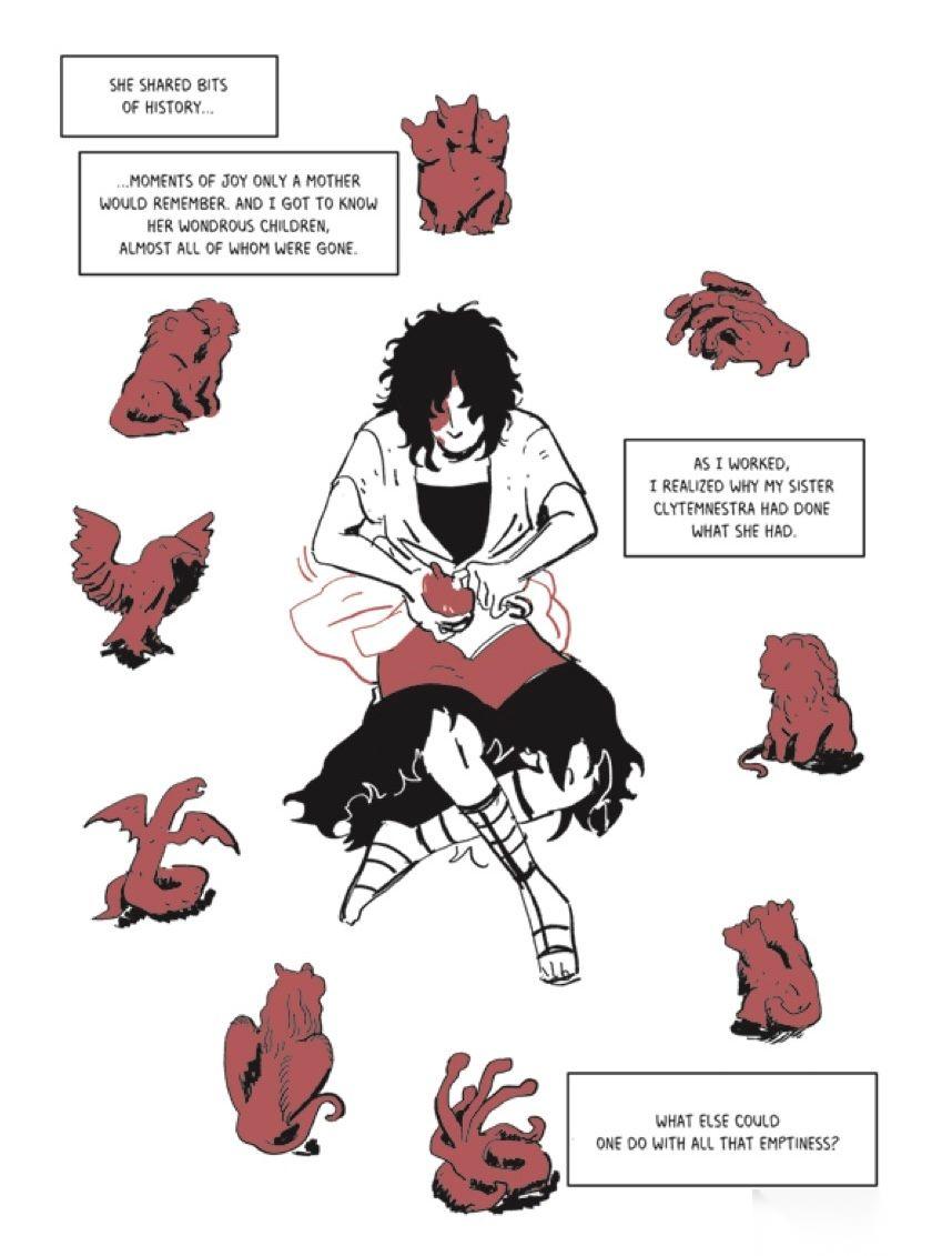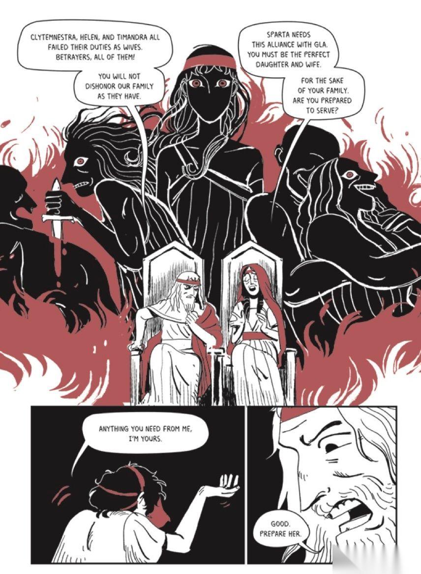 我希望这本书对任何人都适用,因为对我来说,这个故事是普世的,就像赫拉克勒斯的旅程对每个人一样。童话和神话通过口头传统讲述给所有年龄的人,娱乐每个人并向人们传授一些社会规则。这就是我写这本书真正想要达到的目标,我希望艺术风格能反映这一点。所以它更前卫一点,更成人一点,以一种我想要的特殊和原始的方式。我真心觉得她完成了一些精美的作品,将我的作品提升到了一个新的水平。她在每一页上以非常独特的方式使用红色,这都是她的功劳,能够做到这一点。我爱它。