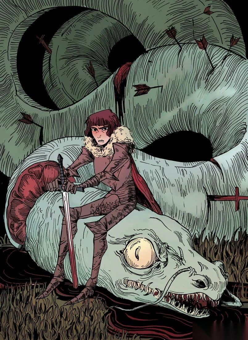 是她的网站——她有一张穿着盔甲的女战士图片,我非常喜欢,来自《被诅咒的公主》系列。一个女孩坐在一条被斩首的龙身上,她看起来非常像圣女贞德,非常忧郁。如此情绪化和美丽。我爱它。她非常擅长表现怪异恐怖。如果你看她的网站,上面有怪异恐怖的东西,但人们的眼睛里也有感情。根据我的经验,在浏览了 literally 数百位艺术家之后,我认为这很难做到。真的很美。所以我希望人们能发现更多她的作品。我自己也等不及想看更多。我很想再次与她合作做点什么。