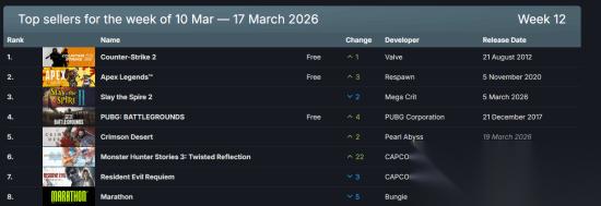 根据SteamDB公布的数据,《红色沙漠》在3月10日至17日Steam一周销量榜达到第二名,仅次于《杀戮尖塔2》。第三到五名分别为《怪物猎人物语3:命运双龙》、《生化危机9:安魂曲》、《失落星船:马拉松》。(排除免费游戏)