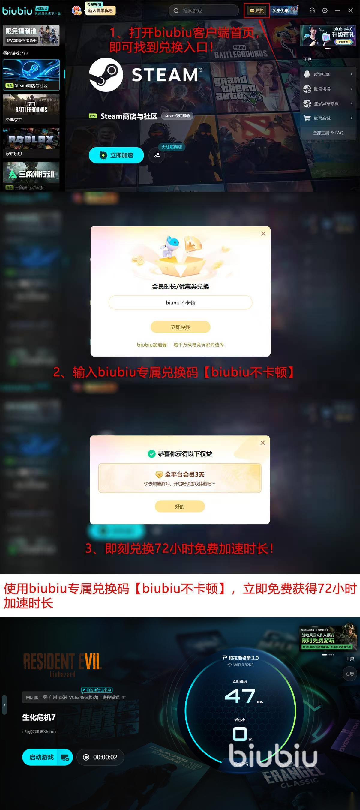 新用户注册biubiu加速器即可获得24小时全功能免费试用,输入【biubiu不卡顿】,更可额外领取72小时免费加速时长,双重福利叠加,共计96小时的优质加速体验。