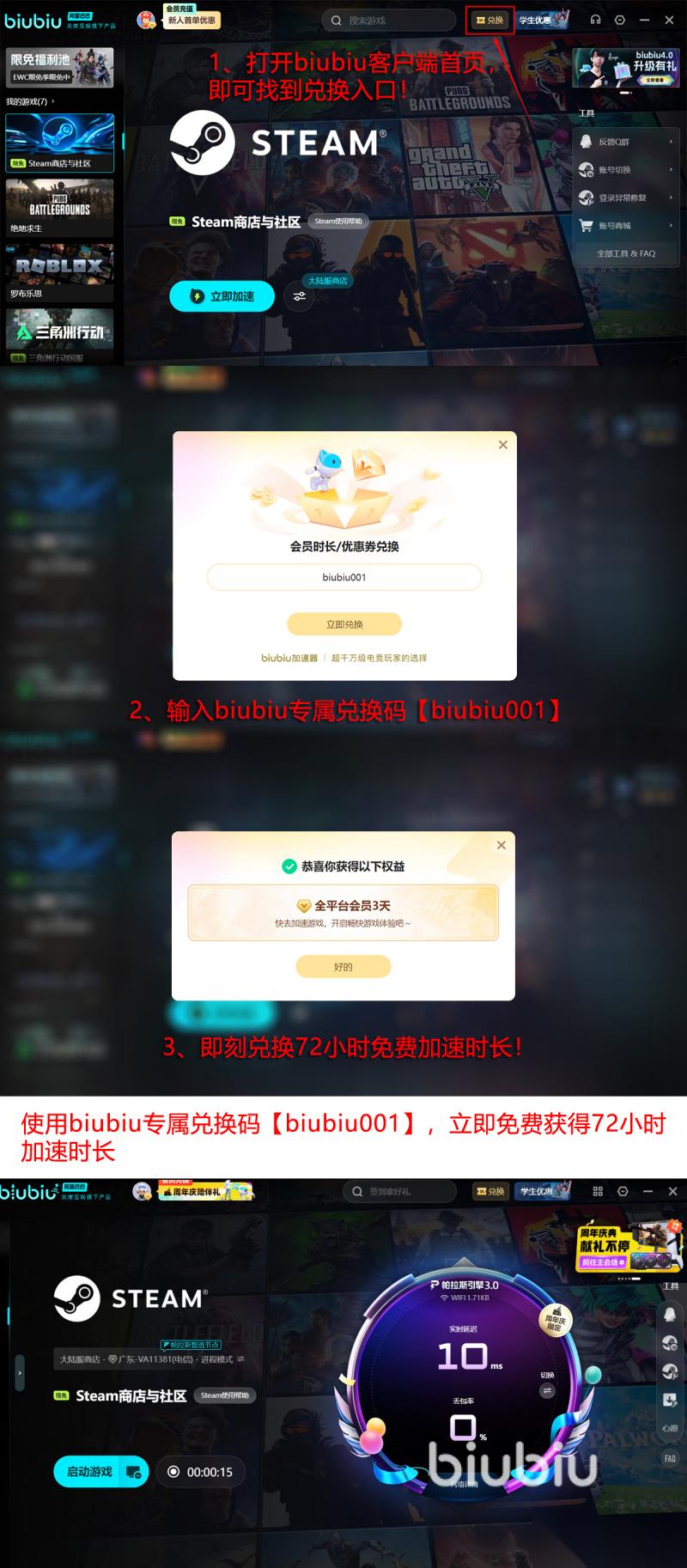 目前所有用户都能够参与免费试用活动,对效果并不了解,甚至也有所顾虑的话,可以领取免费活动试用几天再决定是否要使用,上方推送出链接,点击进入就能够直接安装,这属于正版地址,安装后新用户注册完成实名认证,即可获得24小时免费加速时长,所有新老玩家使用兑换码【biubiu001】成功获得长达三天的免费加速福利,新用户能够将两种福利全部领取,最终叠加至96小时。