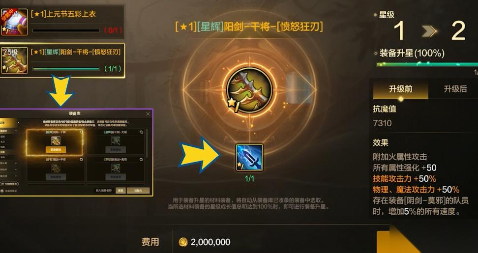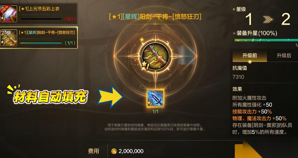 装备升星时,只消耗装备库里的材料装备,材料会自动填充;如果装备库中没有剩余的同名装备,将无法进行升星。