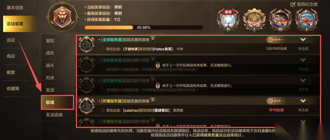 同时,在【冒险团】-【活动奖章】-【极境】中,新增了超越武器专属奖章。