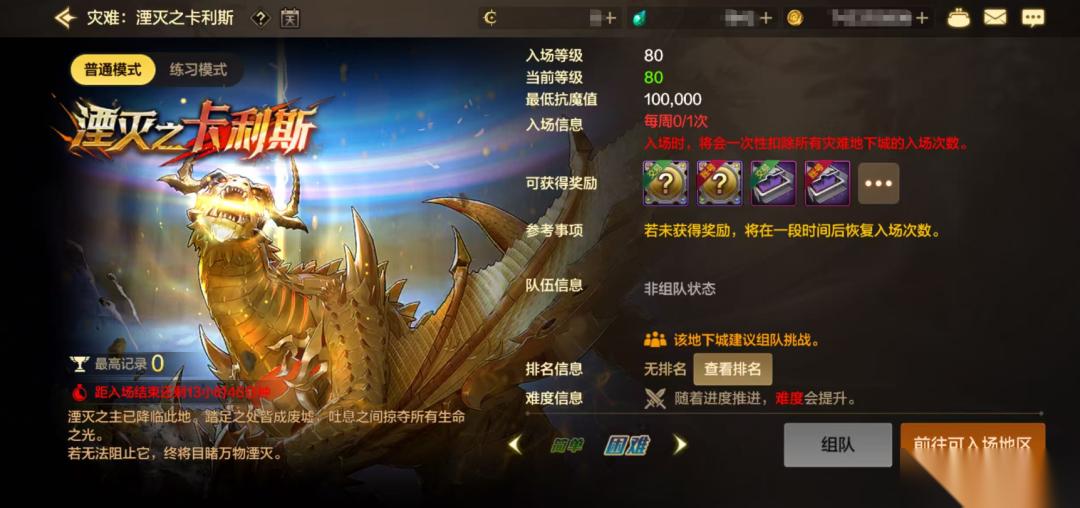 由于灾难:湮灭之卡利斯的困难模式入场等级是80级,当角色等级达到80级后,会自动开放困难模式,大家安心升级即可。