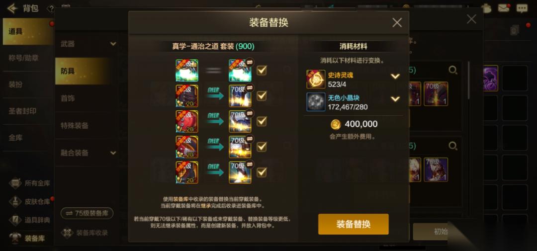 3、把防具、首饰、特殊装备、融合装备全部换成70级毕业装备。