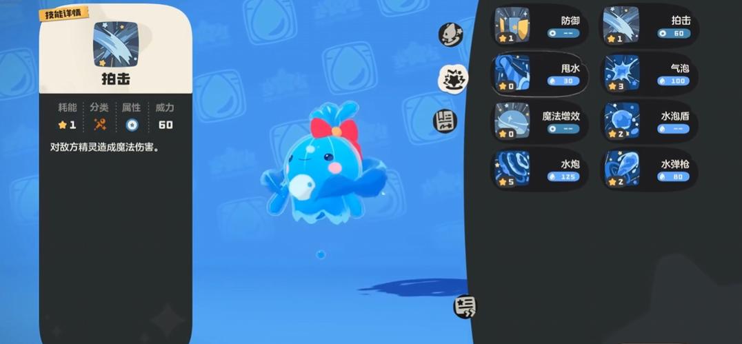 3号技能推荐“水光冲击”,作为稳定输出手段,可对单体目标造成140点魔法伤害; 4号技能可在“魔能爆”与“当头棒喝”之间择一装配:“魔能爆”的伤害随自身魔力消耗量提升而增强;“当头棒喝”则在切换出场精灵时自动触发,对当前目标施加一次高额固定伤害。