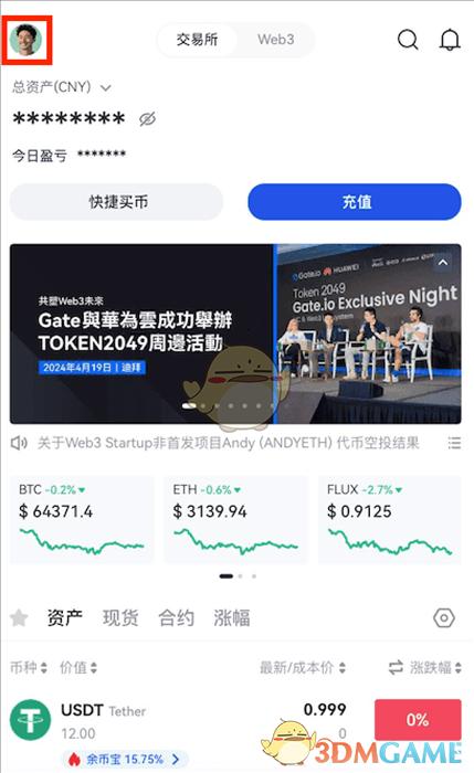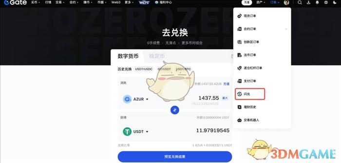 1、登录Gate个人账户,点击导航栏“交易”—“闪兑”。
