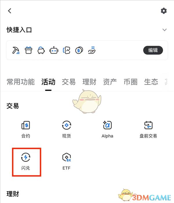 2、点击“交易”栏中的“闪兑”进入闪兑页面。
