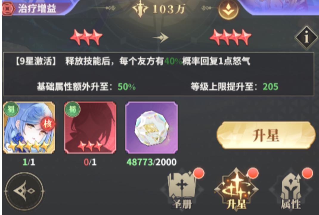 升阶过程中最大的难题就是角色达到8星之后。8星升9星的时候,玩家需要本体1只、同阵容8星狗粮1只、升阶石2000个。随着角色等级越来越高,9星升10星要消耗更多的狗粮、升阶石,10星升11星就出现了一些高难度的材料需求,尤其是10星升觉醒,所需要的升阶石数量达到5000个。而每一次的升阶都会使角色的能力得到极大的提升,在战斗中发挥出更强的战斗力。