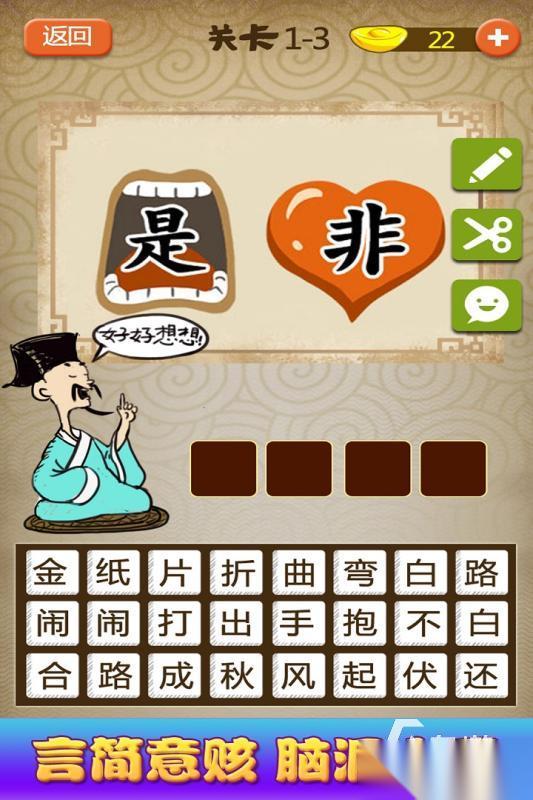 《猜成语达人》采用了可爱纷呈的背景风格,用于各种让人大开眼界的对成语模拟意会的图文设计,让我们在一种快乐感的包围下去进行猜测,每一关都具有着数量不等且不重复的题目组成,而且游戏无进行道具的设定,需要大家完全凭借自己的能力去完成挑战,答题积攒的积分我们可以用来提升人物的官职。