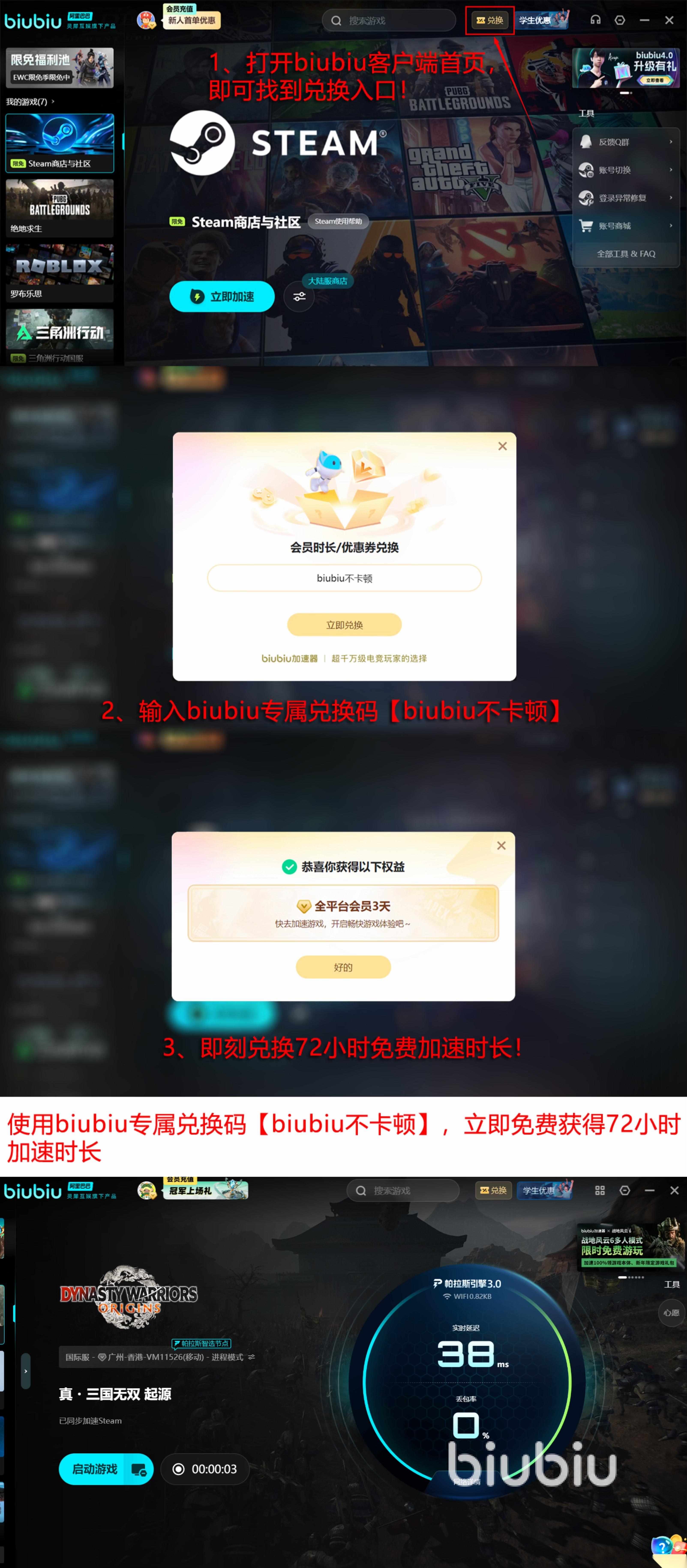 除了实力到家之外,biubiu的福利也很到位,它有一个专为新朋友开放的注册领取24小时体验时间活动,只要经过简单的实名认证就能领到。想拥有更长体验时间,全部用户还能用【biubiu不卡顿】兑换口令来领3天加速时间,相信体验后,它的真实效果会让朋友们惊艳。