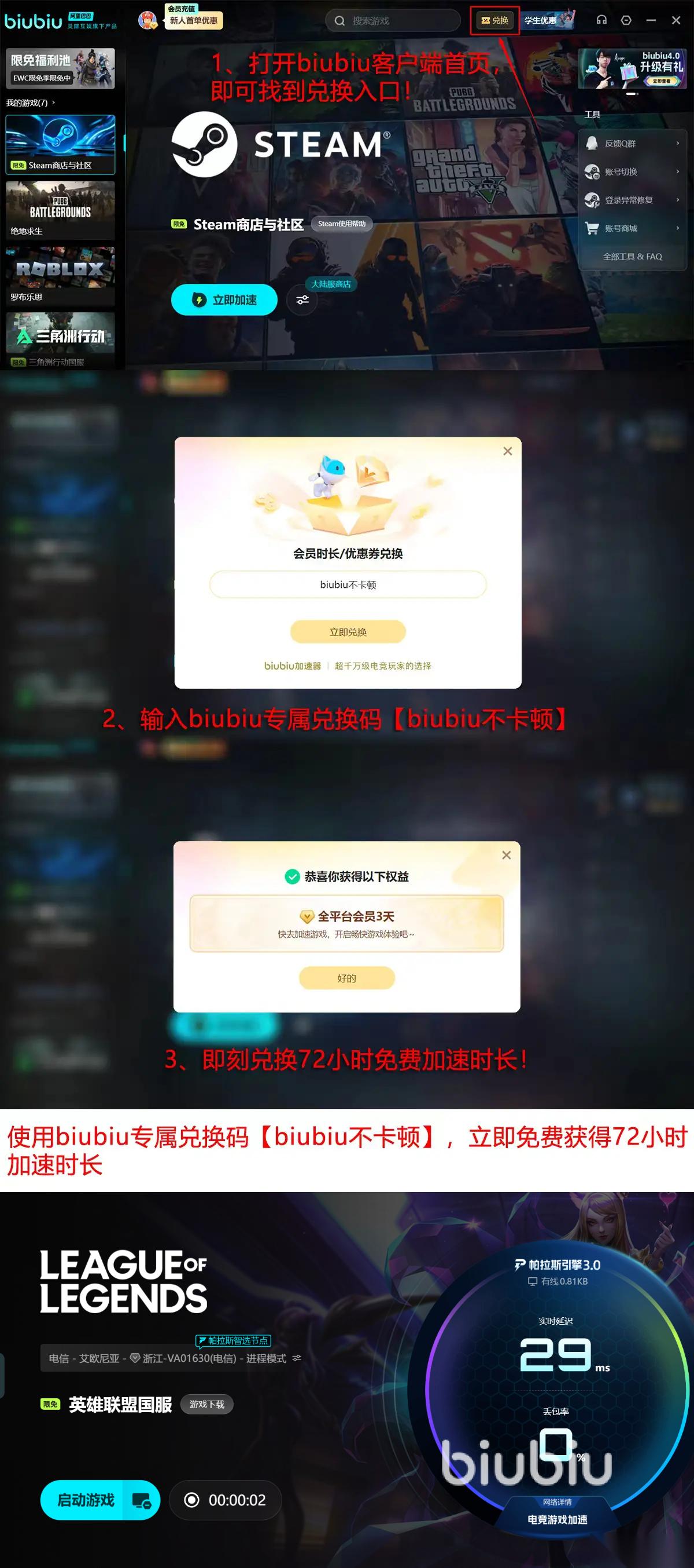 并且biubiu对新人也非常友好,现在注册该加速器,新用户即可免费获取24小时加速时长,并且在输入兑换码【biubiu不卡顿】之后还能解锁72小时的免费不限游戏时长(该兑换码老用户也可以使用),加起来总共时96小时的免费时长。