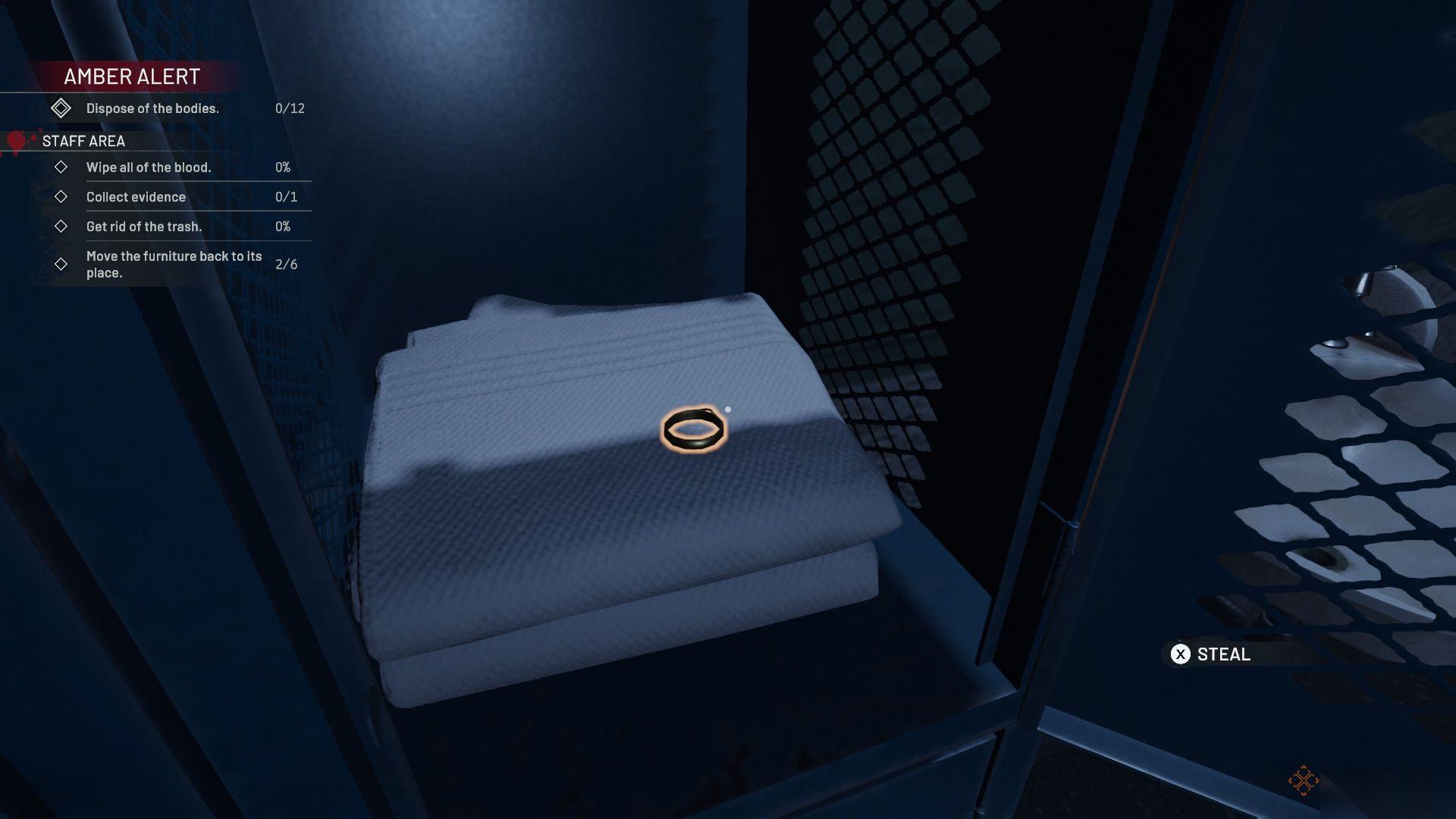 在员工区,地上有一具尸体,把她捡起来放进容器里。擦掉血迹,并把两把椅子放回原位。你可以在楼梯附近的其中一个储物柜里偷到一个贵重戒指。