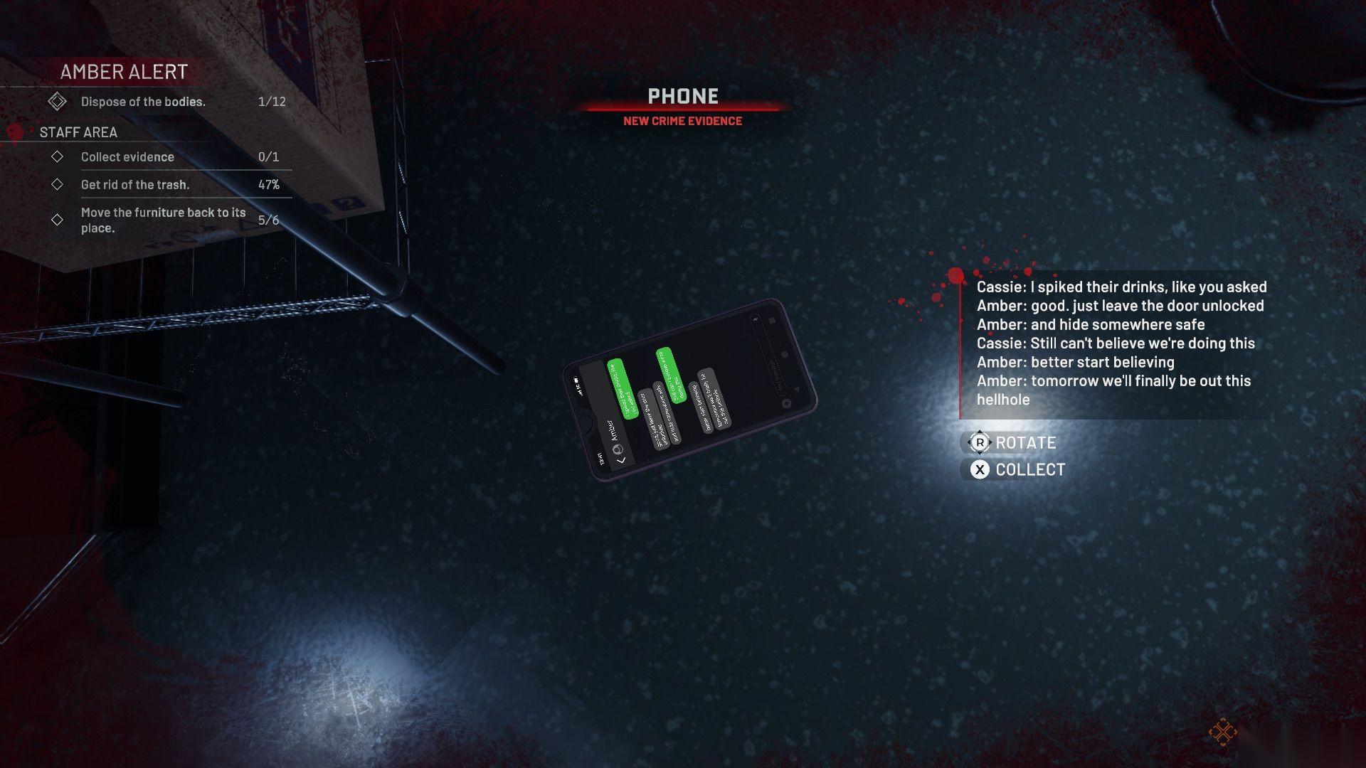 从侧边区域拿走两条贵重项链和戒指,查看一下带纸条的毛绒熊,然后继续前进。走上下一段楼梯,地板和墙上到处都是血。清理干净,并在地板上找到手机(证据)。