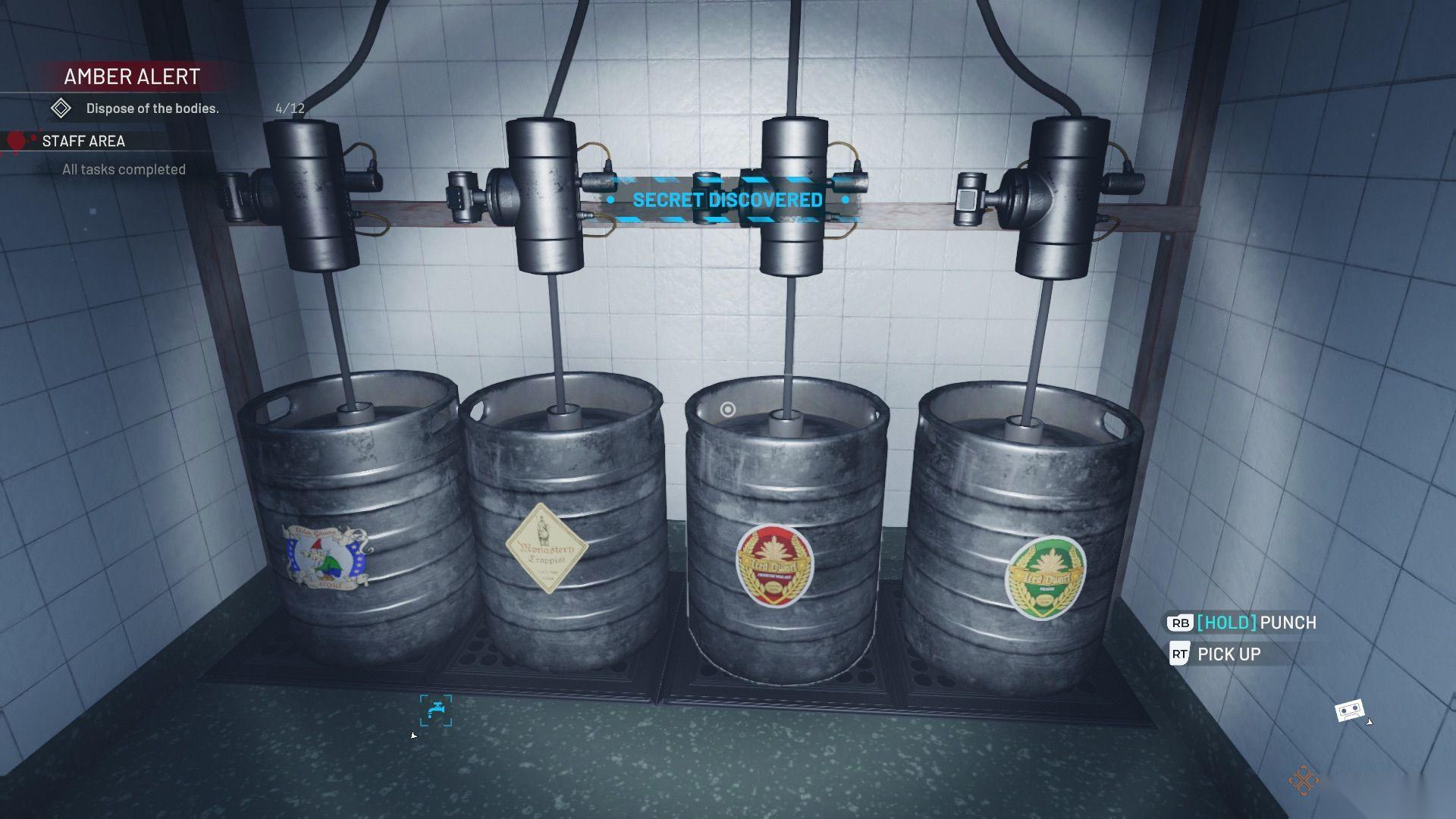 从方格区域穿过拱形门道,是一些厕所。最右边那个厕所里有一把吧台凳,需要拿回它该在的地方。下一个区域有一些贵重物品可以偷,还有一个水桶点。在前往楼上的办公室或楼下的入口之前,先回到主酒吧区域。