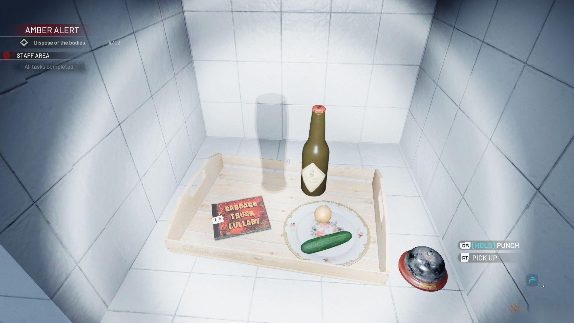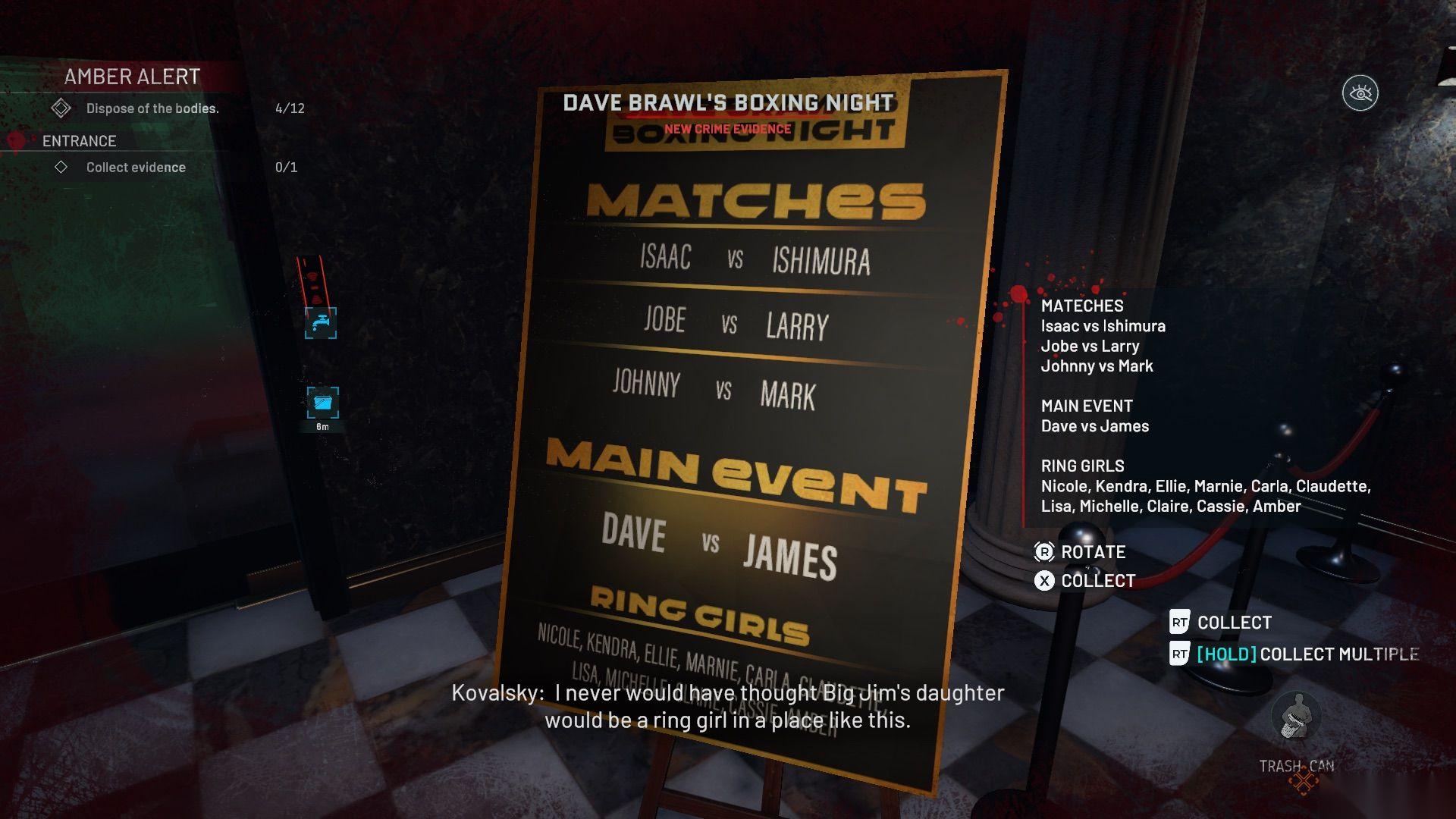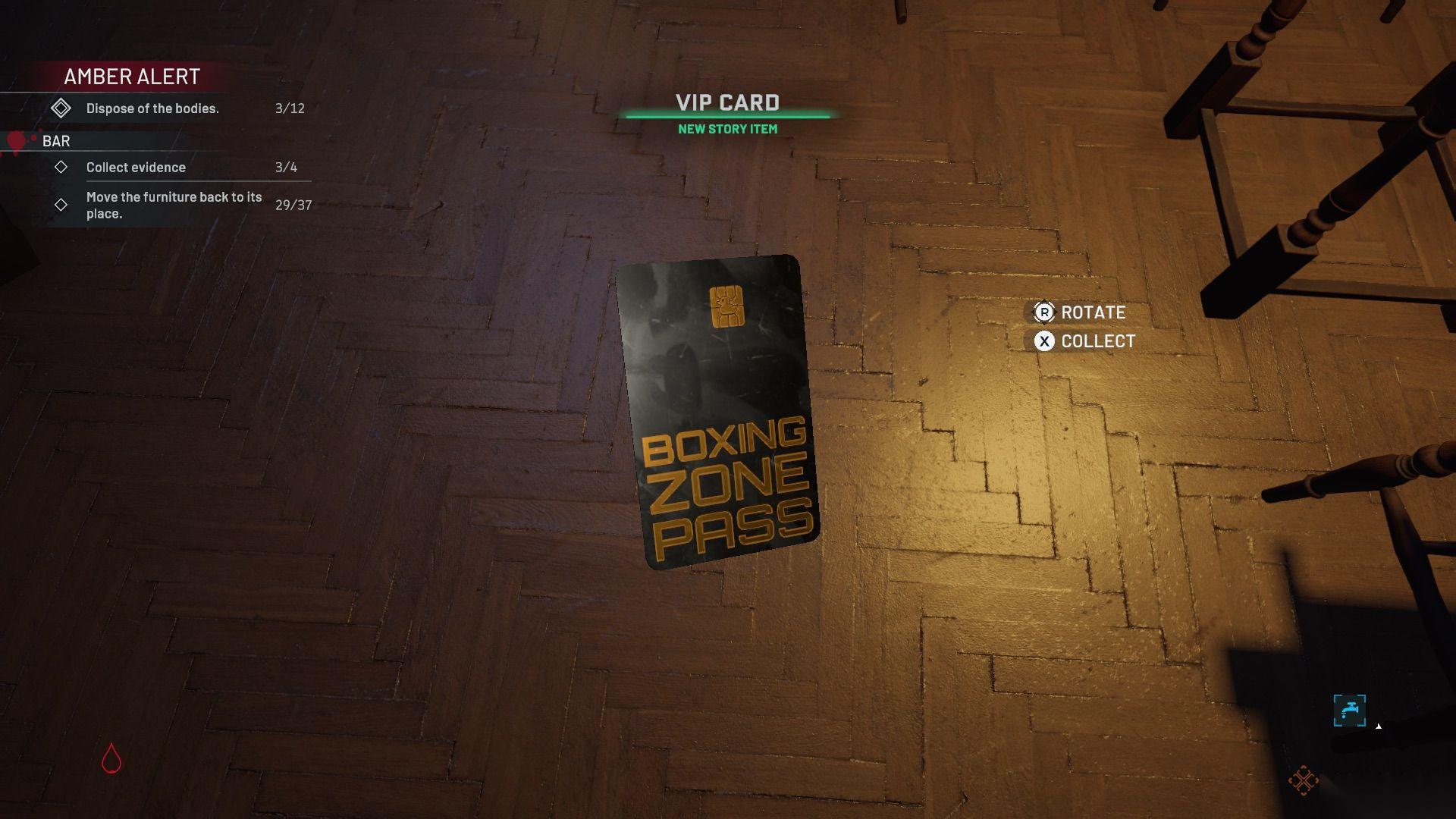 现在拳击台已经打开,你可以完成清理了。捡起武士刀(证据)和指虎(证据),并移除尸体。尸体坐着的椅子应该放回主酒吧区域。