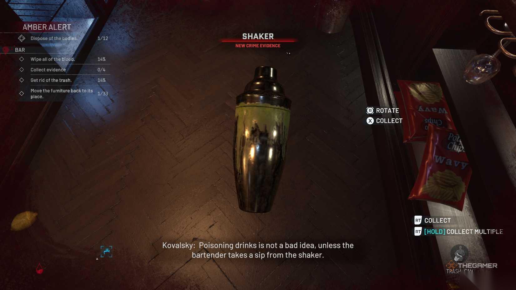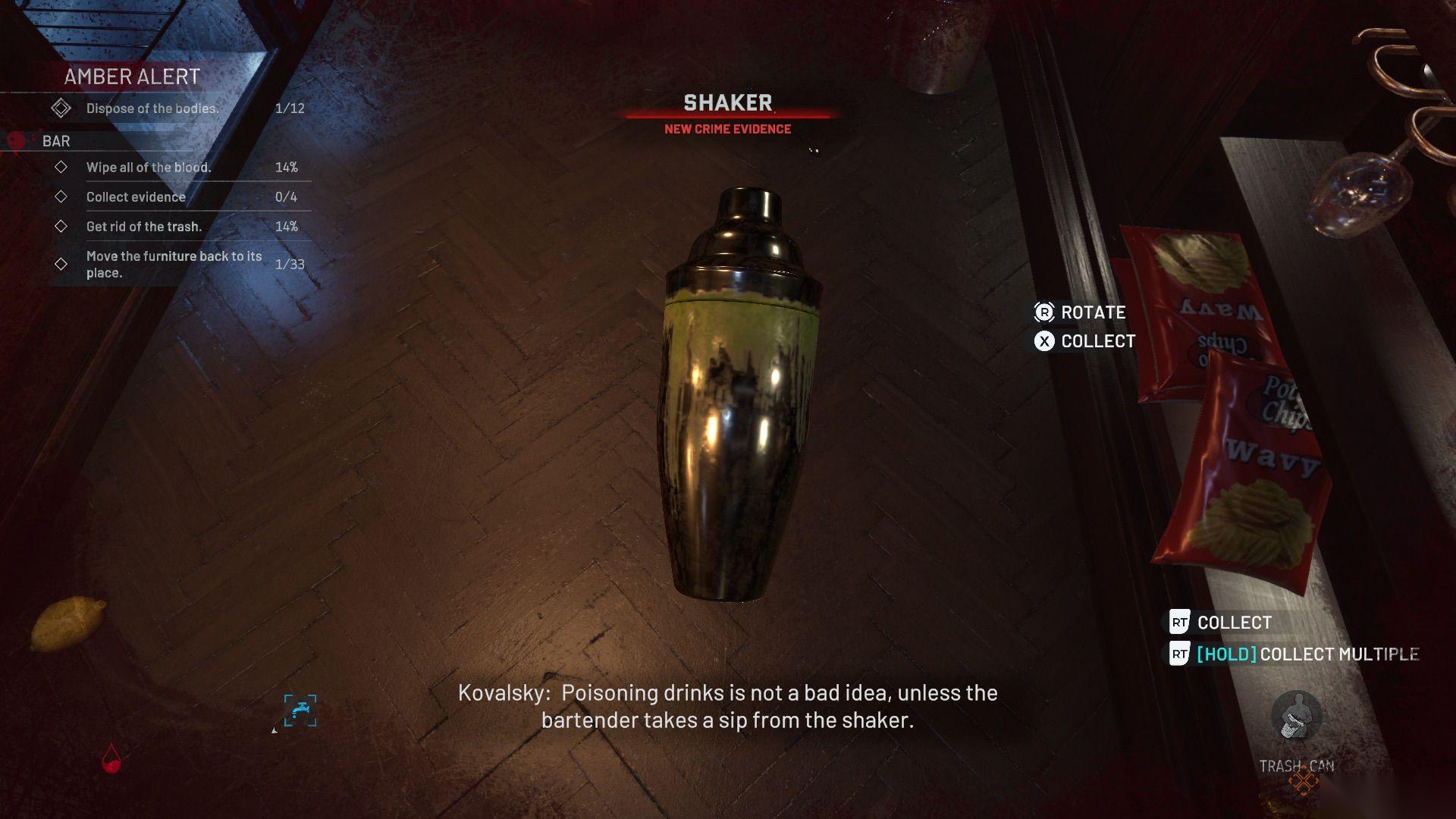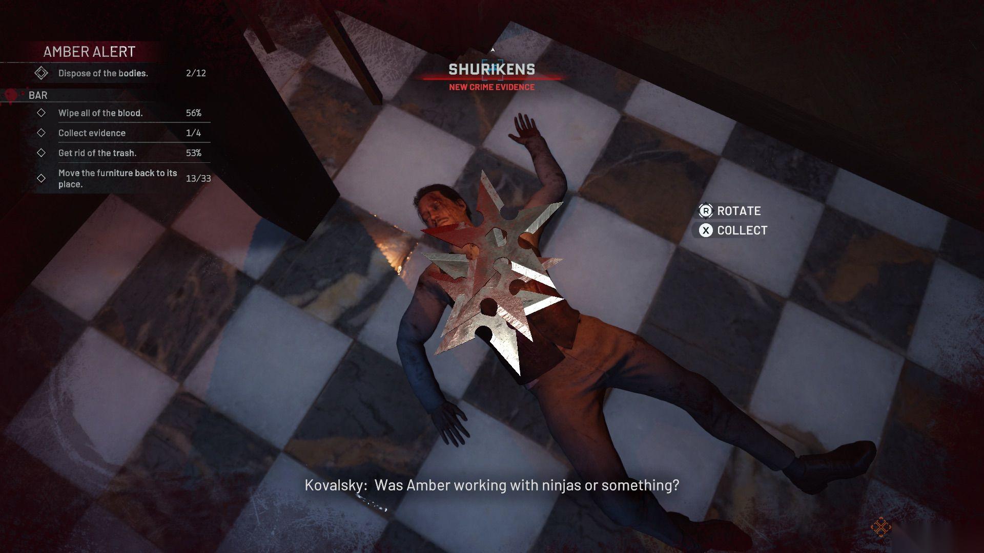 许多椅子散落在酒吧的不同区域,所以你得来回跑才能把所有东西整理好。在铺着方格地板的那片区域,有一具尸体,上面和附近的柱子上插着手里剑(证据)。吧台后面有一个鸡尾酒摇酒器(证据),还有很多玻璃碎片和血迹。