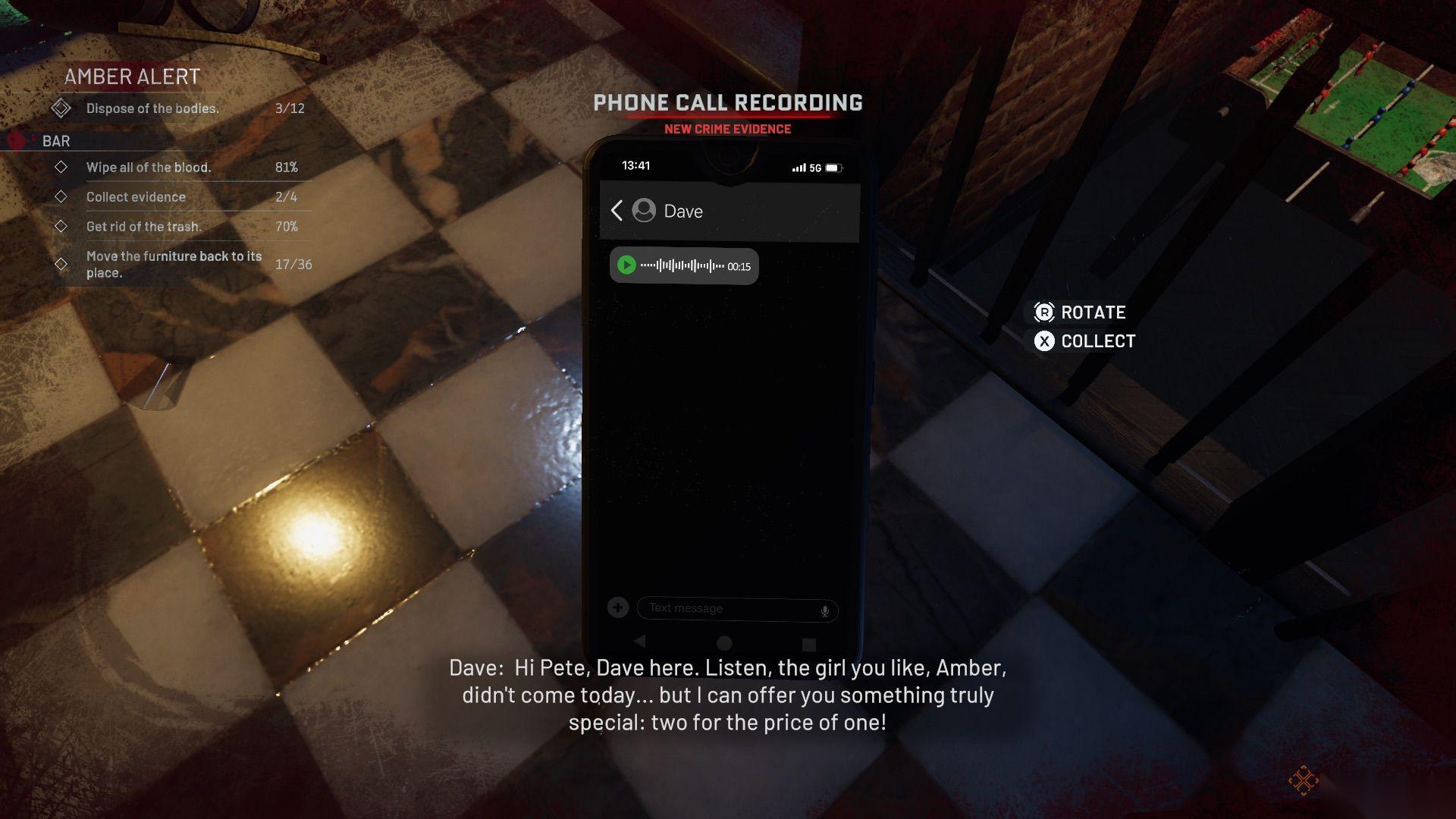 当你第一次进入酒吧时,可以看到前面卡座旁边有一具尸体,还有大量破碎的玻璃、血迹和散落的家具。在尝试把家具放回原位之前,先清理掉污迹并捡起垃圾。如果你在清洁时打碎玻璃产生了额外的垃圾,确保全部捡起来。