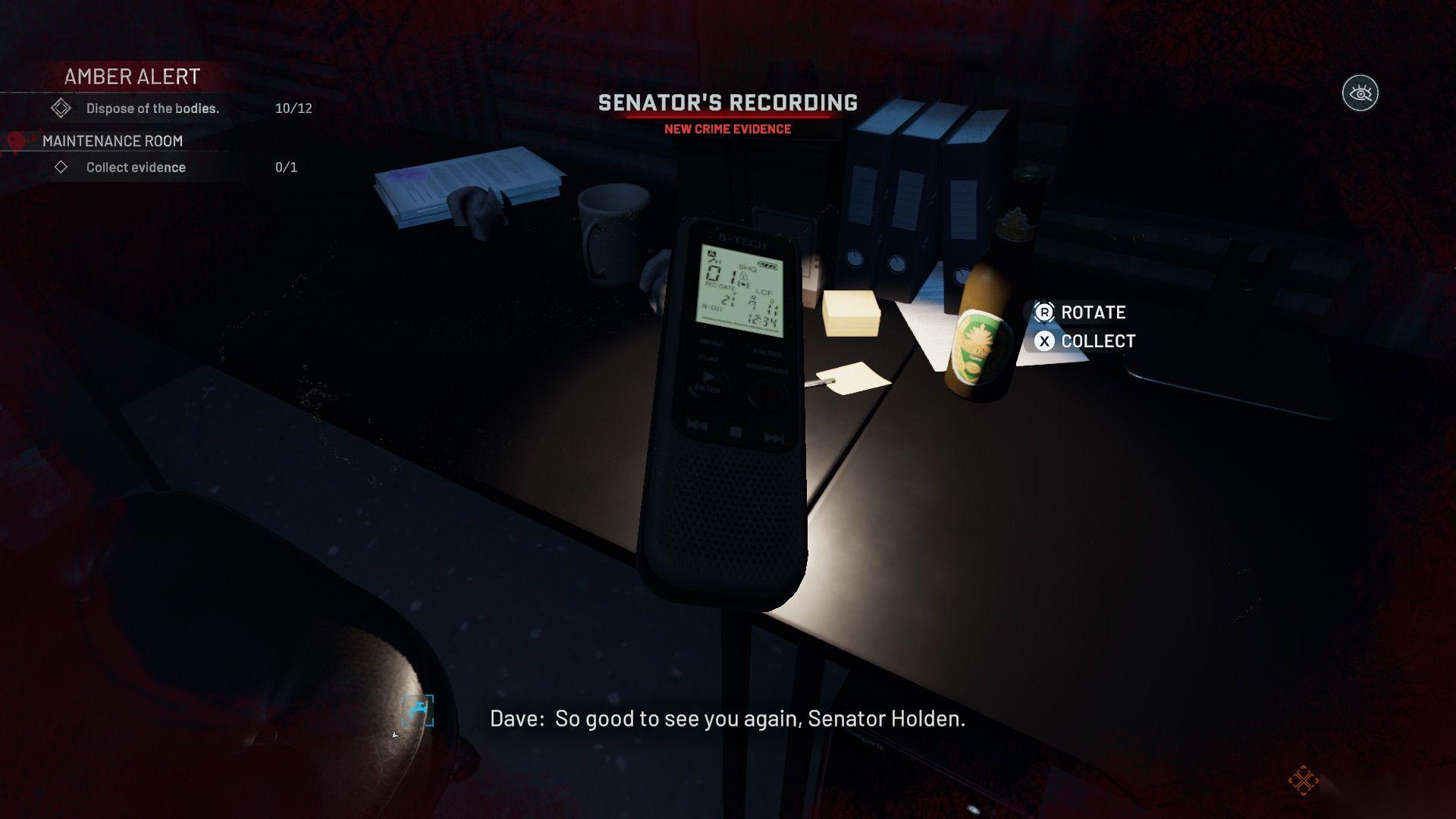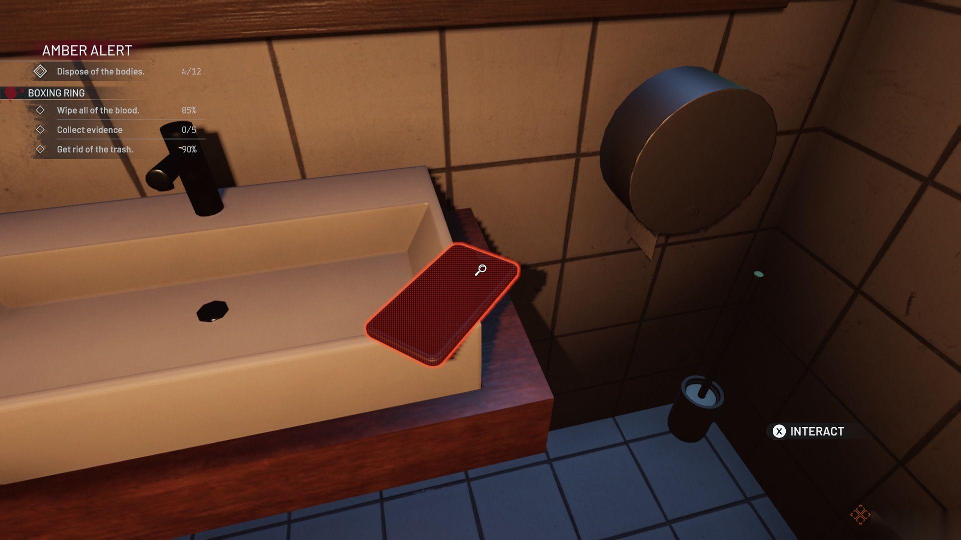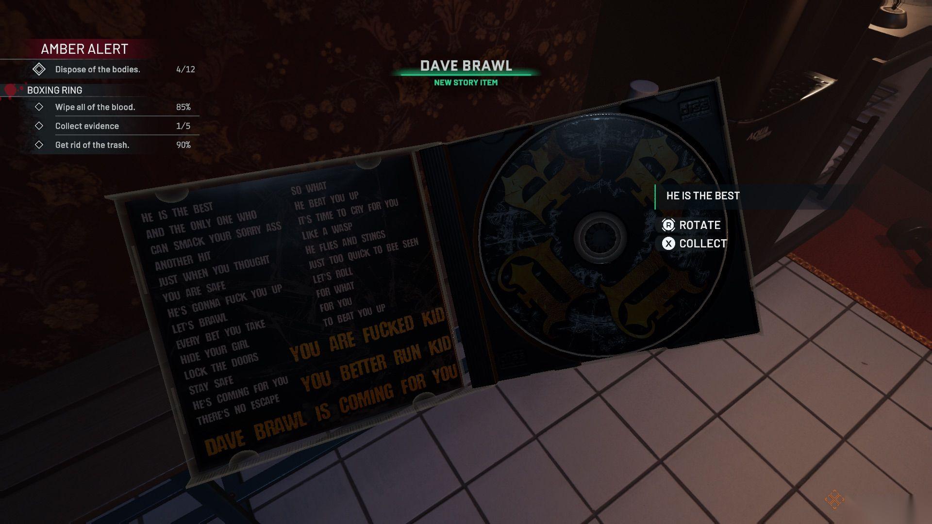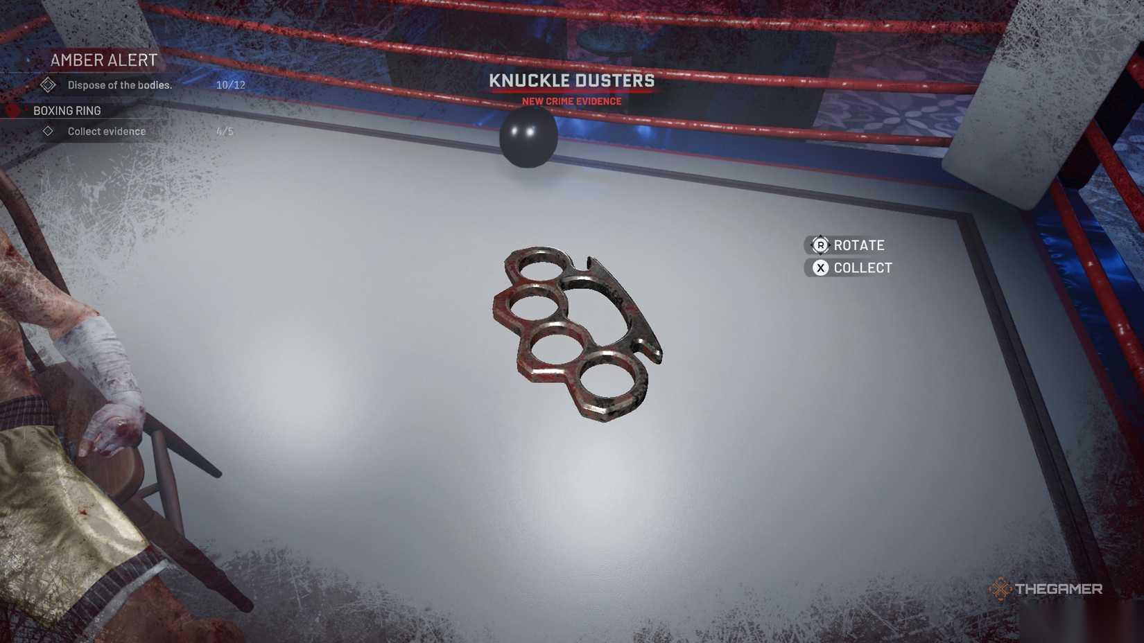 桌子上有一个录音(证据),一把椅子需要放回原位,还有一些血迹需要清理。从保险箱里拿走现金,并与窗边的控制面板互动以打开拳击台,这样你就可以进去清理了。