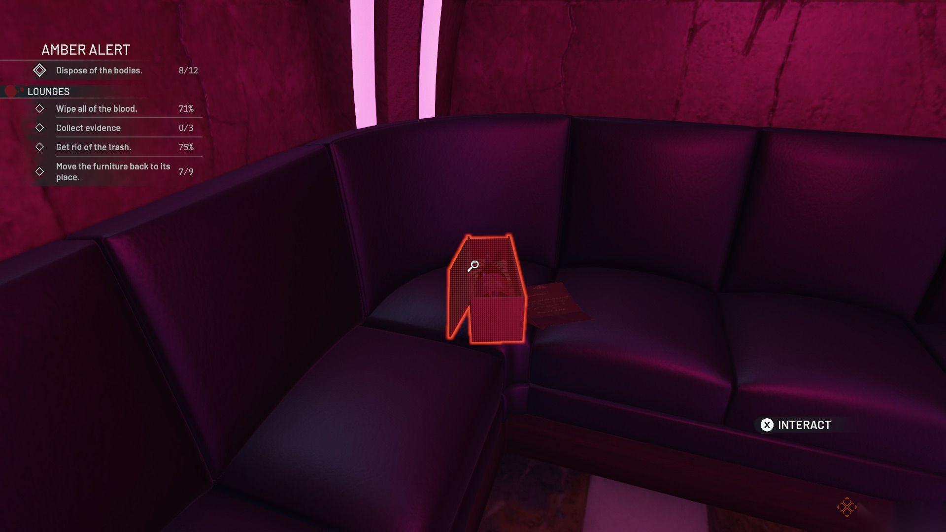当你走上通往休息室的楼梯时,就有一具尸体。在清洁、清理区域并将家具放回原位之前,先把他处理掉。在有钢管舞杆的私人房间里可以找到贵重物品。在另一侧,有一片巨大的混乱和两具需要捡起的尸体,座位上还有一些证据。