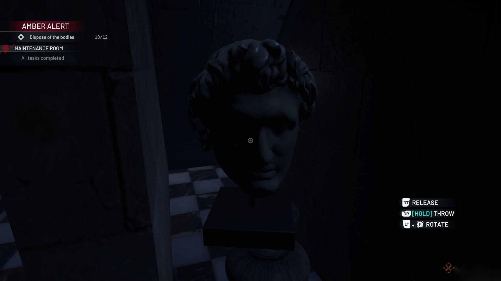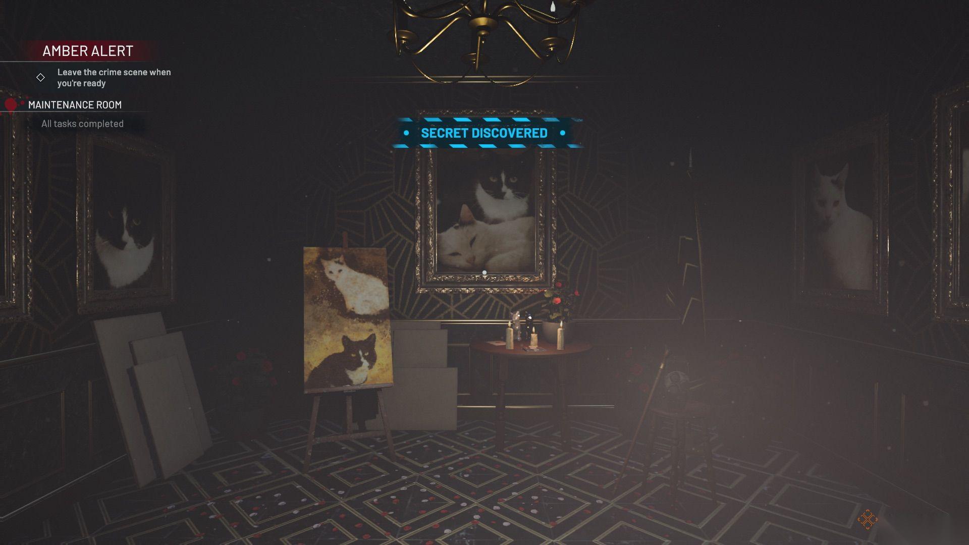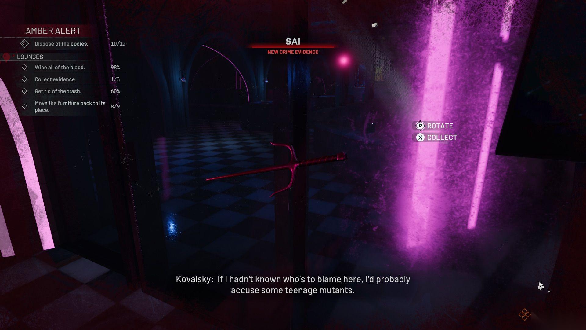 这是本关卡中你需要清理的最大空间,有15件家具需要归位,到处都是血迹,周围还有很多破碎的垃圾。当你走下楼梯进入这个区域时,向左走到休息区,在桌子上找到一个贵重面具。