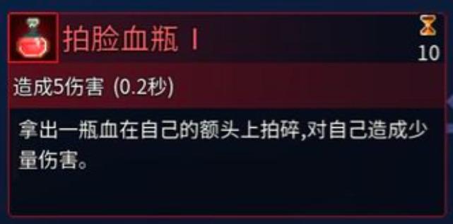 介绍:将一个血瓶砸在自己的额头上,对自己造成少量伤害。