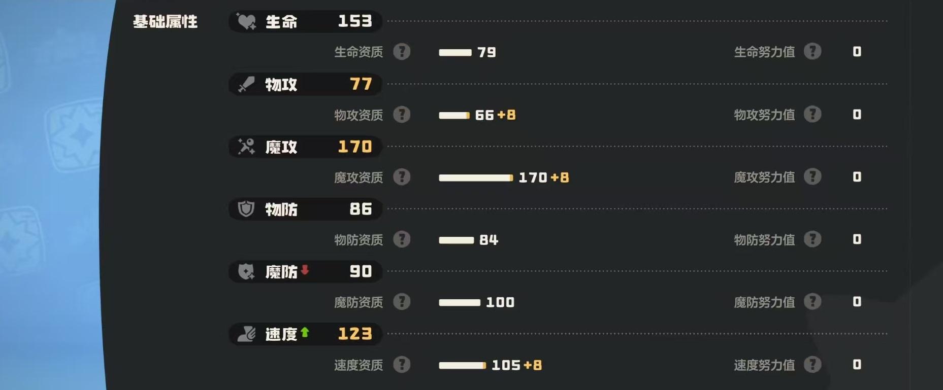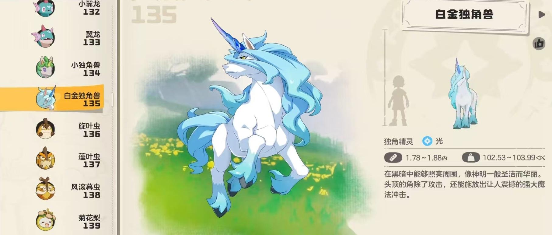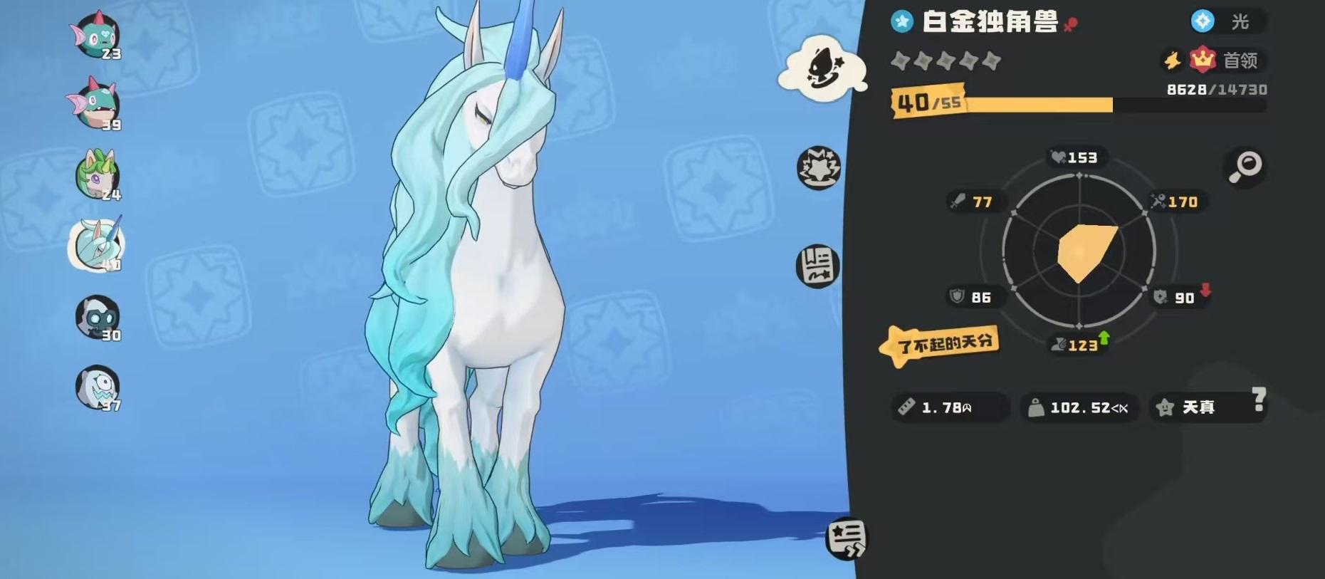 白金独角兽是属于光属性的精灵,它的特性是目空,非光系技能威力提高25%。这个特性非常独特,因为大多数精灵都是自身属性技能威力高,而白金独角兽的这个特性则完全相反。资质很高,总资质604,生命79,物攻66,魔攻170,物防84,魔防100,速度105。拥有目前所有精灵中极高的魔攻属性,在性格方面,小编推荐加魔攻减少物攻,,这样做到极致。这样来看,保守性格是最合适的选择。