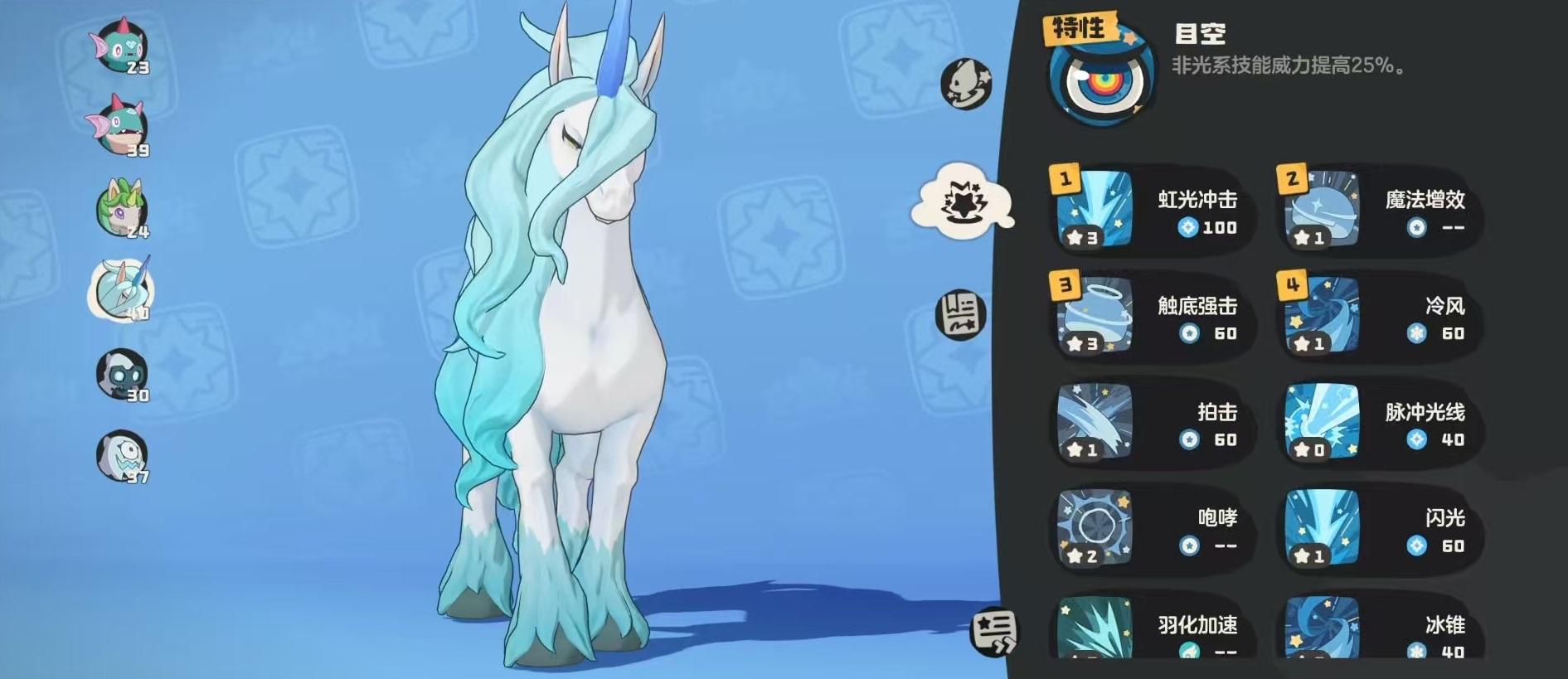 在技能搭配选择上,为了能够突出自身的特点,当然是以魔法攻为主。小编的搭配是虹光冲击、魔法增效、触底强击和冷风这四个,搭配的思路是强化输出能力。冷风,造成魔法伤害,威力60。虹光冲击,威力100,对敌方精灵造成高额魔法伤害。触底强击,威力60,造成魔法伤害,如果释放后能量耗尽,本次攻击威力加100。魔法增效,直接提升80%魔攻。这样搭配起来,再配合上自身属性上的优势,甚至可以对敌方进行一击秒杀。