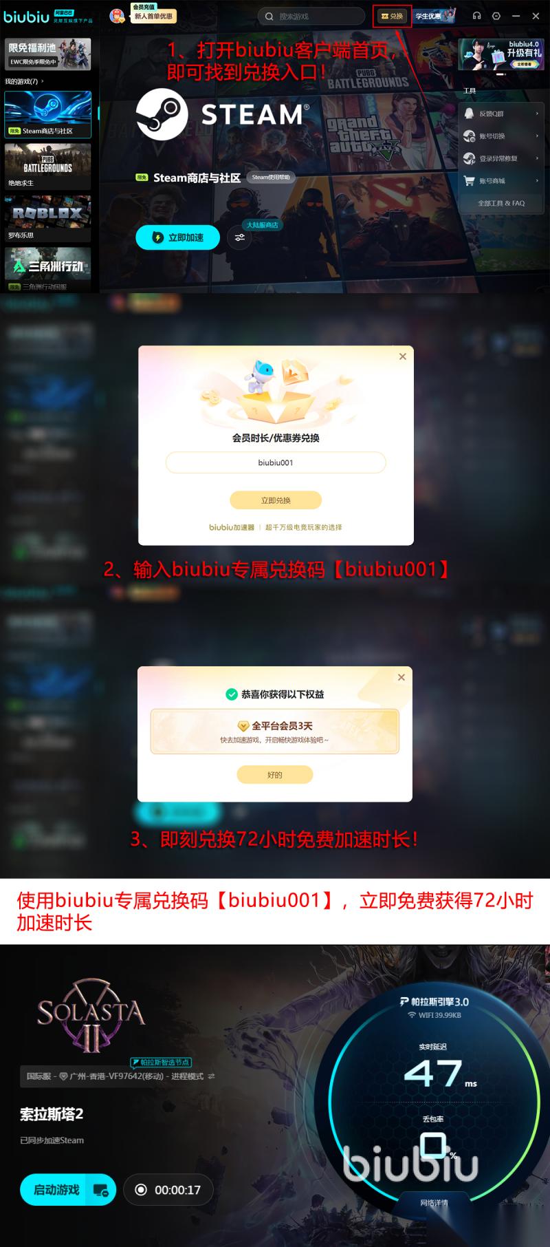 现如今biubiu加速器有专属福利,比如新老用户用兑换码【biubiu001】,能领三天免费时长,新用户注册再送24小时免费时长。针对新用户而言,这两者叠加在一起使用,总共可以享受96小时免费加速,在这样的情况下,能够让大家畅玩没有任何的压力。