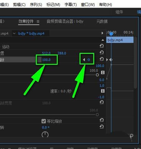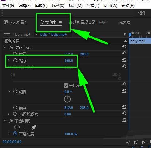 3、之后到“效果控件”——“运动”——“缩放”便可以看到100%(即画面满满)。