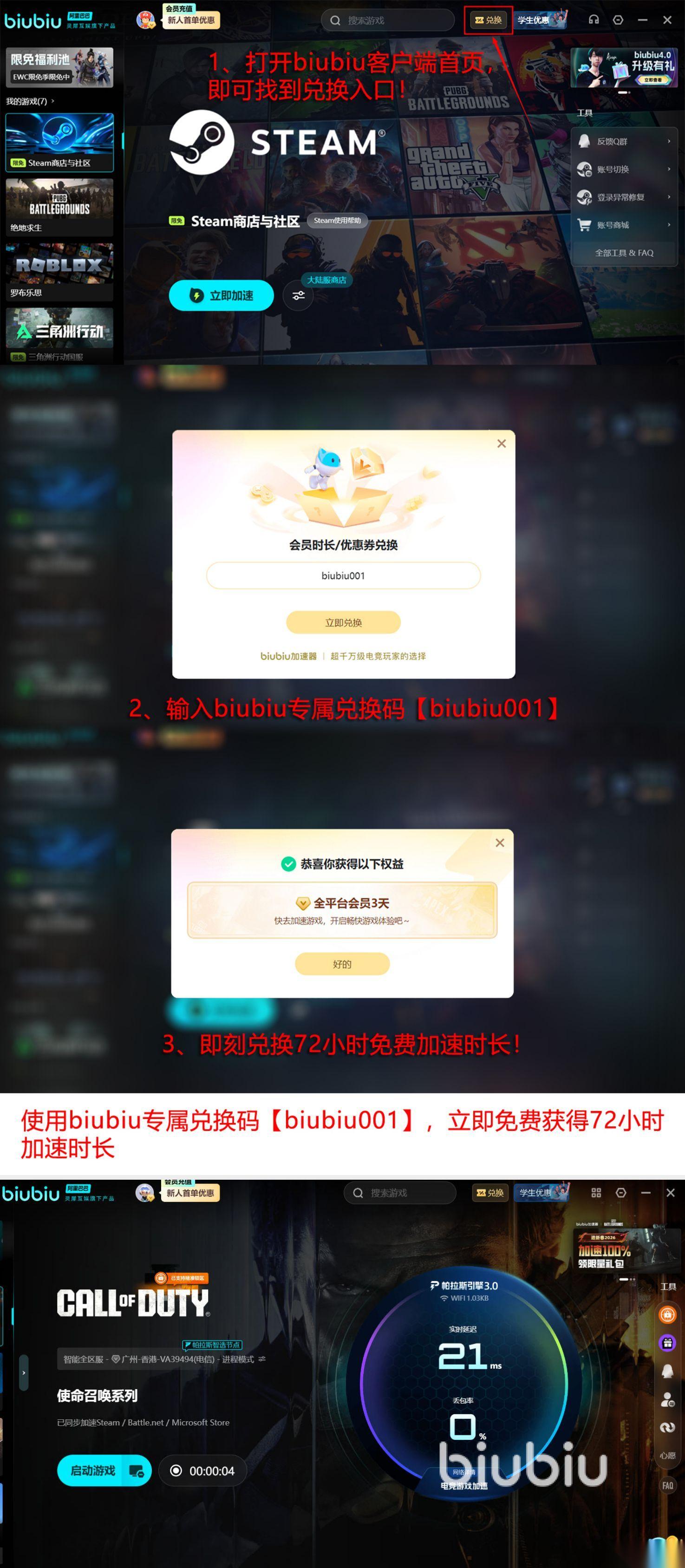 其次还给大家带来了很多贴心的服务,当按照两种方式领取之后大家就可以享受长时间的免费体验权限,比如第1次用账号成功激活之后,就可以拥有24小时的加速特权。另外用完之后还可以再次输入【biubiu001】,再次领取72小时的免费加速特权,那么算下来就可长达至96小时,任意挑选自己喜欢的游戏。