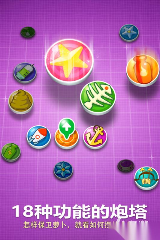 《保卫萝卜》作为大家都很熟悉的塔防游戏,初代放到现在依旧很值得玩,游戏里的萝卜外形圆滚滚的,不管是表情还是动作都显得很呆萌。玩家只需要阻止路上不断出现的怪物碰到萝卜就可以继续游戏,每一关都能选择多种不同的玩法思路,玩家可以放置功能各不相同的炮塔。游戏画面是经典的卡通手绘样式,颜色看起来很鲜亮,怪物被打败后的模样也显得很有趣。