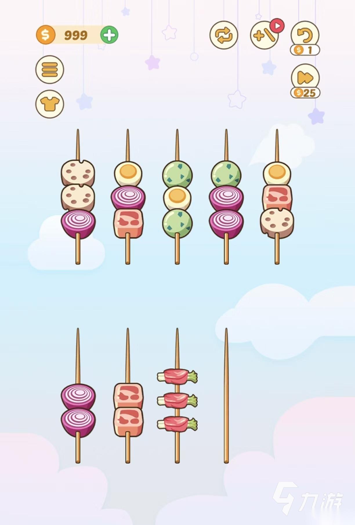 《BBQ排序拼图》这里的关卡会出现竹签,还有非常多的烧烤食材,要将相同的食材放到同一个竹签上,按照正确的顺序进行排列。自由的思考移动的顺序,全部排列正确才能前往下一关,通过关卡的不断提高,竹签和食材的数量会增加,只有相同颜色的食材才可以放到一起,还推出了多个不同的主题,挑战是不会受到时间要求,可以很轻松的进行体验。