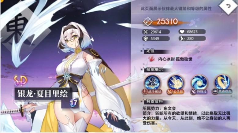 梦的第七章银龙·夏目里绘有什么技能,银龙·夏目里绘登场时获得1层免死效果。银龙·夏目里绘在场时,敌方复活的伙伴会被冰冻15秒,该效果一场战斗最多生效1次。