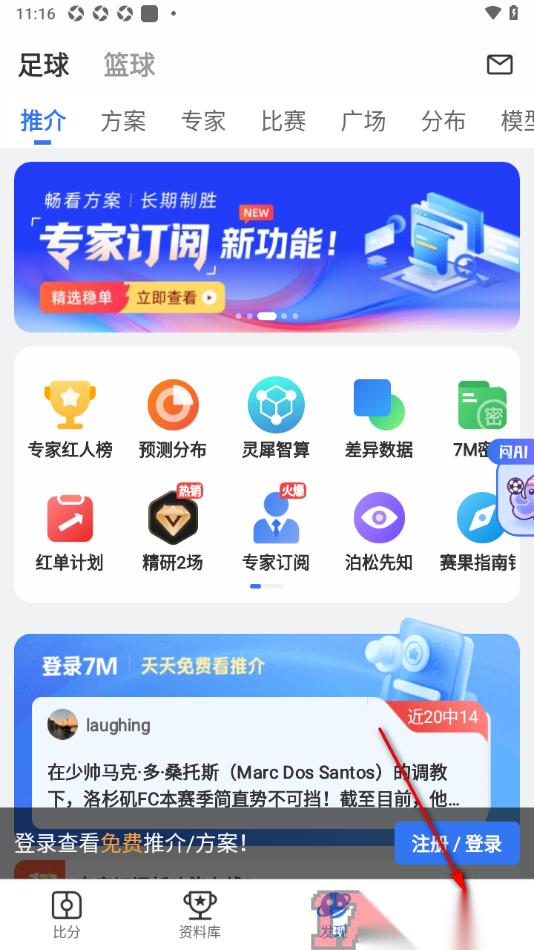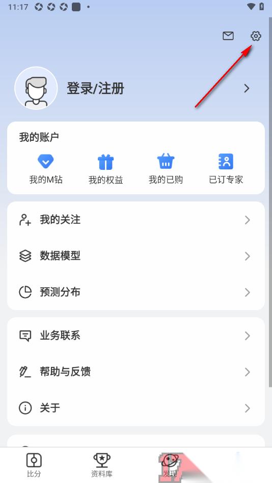 1.来到当前打开的7M足球实时比分app操作界面中,在打开的页面上选择右下角显示的我的选项点击打开即可进入。