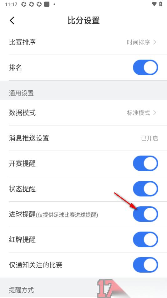 4.当我们来到当前打开的窗口中,滚动页面选项找到其中显示的【进球提醒】功能,将该功能的开关按钮点击开启即可。