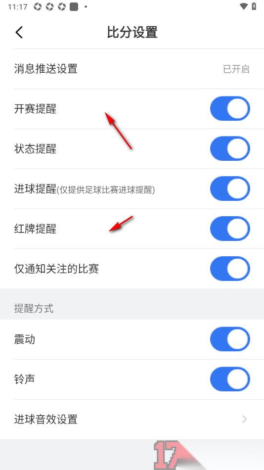 5.除此之外用户还可以设置开赛提醒、状态提醒以及红牌提醒等相关内容,如图所示。