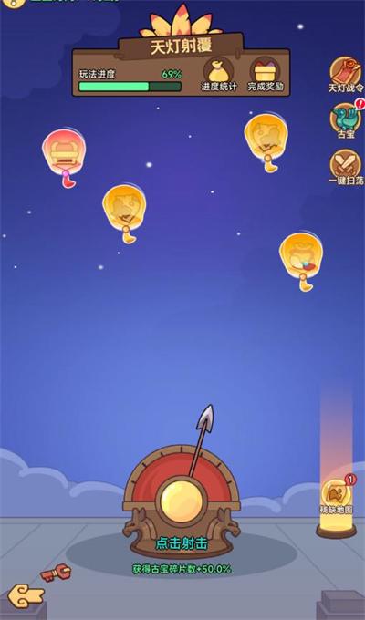 1、每天0点刷新的射箭小游戏,箭矢无限,古宝玩法开启后就会出现,不用担心天灯命中率,优先射增益,其他的直接跟着感觉射天灯就行。主要奖励为元宝、古宝碎片、探秘灵钥、万通宝券(用于古宝商店兑换古宝碎片使用)。