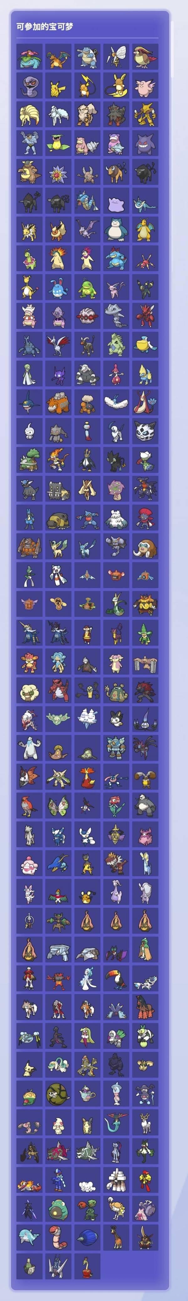 在《宝可梦冠军》中登场的宝可梦里,只有以下“可参加的宝可梦”中所显示的宝可梦可以参加。