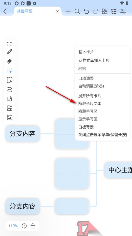 Mindhive思维导图APP在不少用户的手机上有安装使用,大家在操作这款软件的时候可以选择一个自己喜欢的模板样式来创建,在创建思维导图的过程中,有些时候想要知道如何才能设置将卡片中编辑的内容全部隐藏起来,不让任何人查看,那么该如何操作呢,一些用户编辑的卡片内容比较重要,不喜欢被其他人查看到,那么可以直接将画布中的空白位置打开,在弹出的子选项中将隐藏卡片文本功能点击开启,之后卡片中的内容将会全部隐藏起来,除此之外也可以设置隐藏手写区、开启自动调整卡片大小等功能。