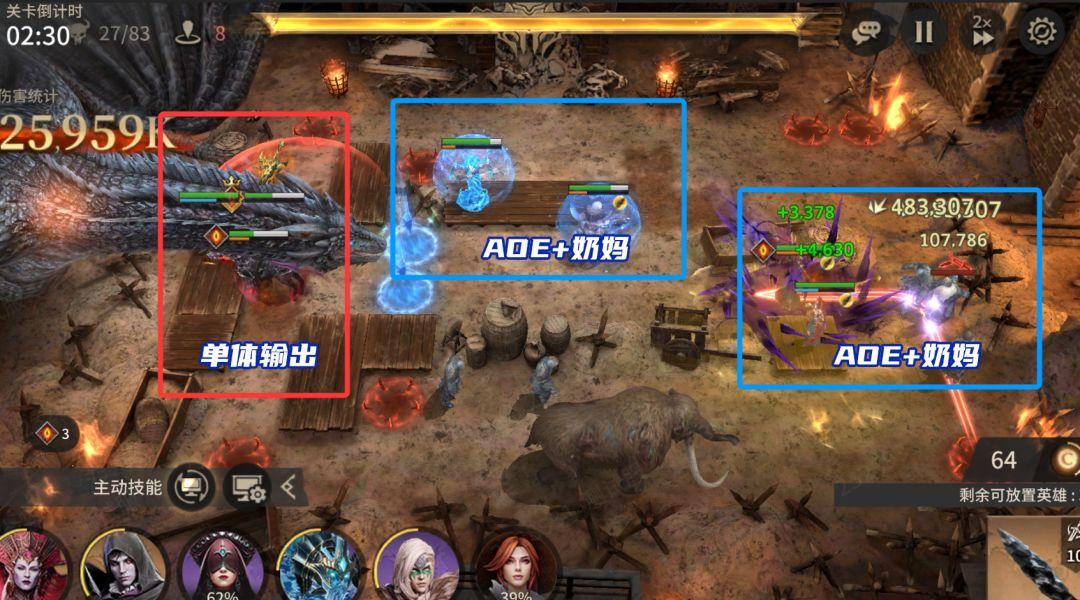 地图区域分为两块,前方蓝色区域要防守群怪进攻,用AOE输出+奶妈配置即可。红色地面位部署单体英雄输出伤害。基本操作思路就是放置1名AOE英雄清怪,红色区域部署高爆发英雄打伤害。BOSS会周期性群攻,3个位置都要部署奶妈提供续航(任意奶妈均可)。