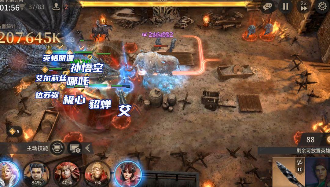 艾可以在地面放置陷阱,猛犸象、骑兵冲过来会被冻住。艾这个位置可以用马尔丽代替,用马尔丽的话要手动释放终结技。
