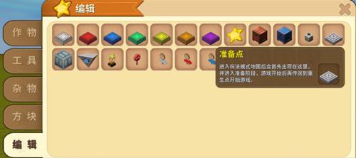 迷你世界游戏里面的准备点道具位置:准备点并不是制作的,我们需要创建开发者模式,在物品栏中的编辑一栏中,就可以发现新增的准备点道具。